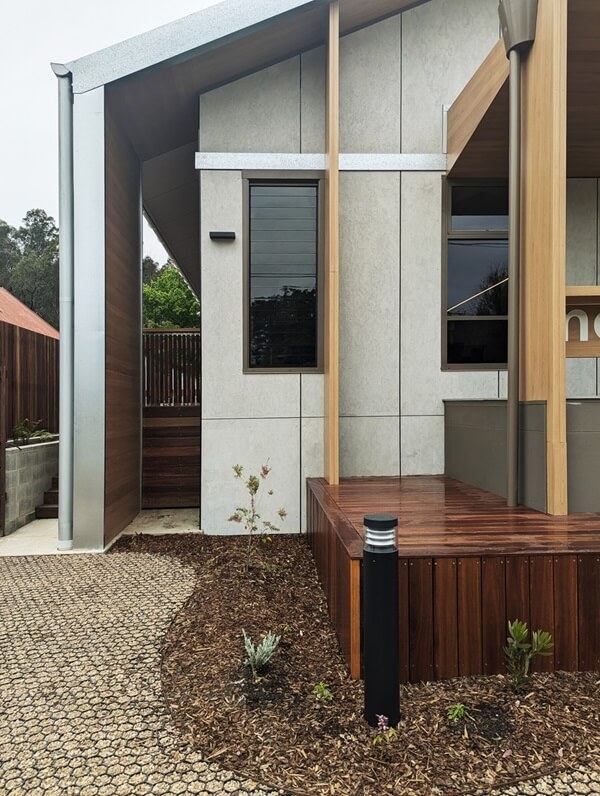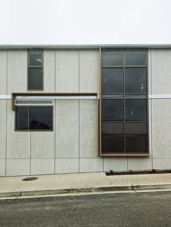 The building form, is a large, pitched roof box with applied cladding. This generic form responds to the heritage context of the traditional vernacular building type. However, the pitched roof is pushed off centre, focusing mass to the intersection of Sydney Street and Annett Street. This results in a large roof face towards the north, providing optimum advantage for solar panels. This off-centre roof ‘breaks the mould’ of traditional forms. This defines the Mogo LALC Community Centre as a unique and special building.