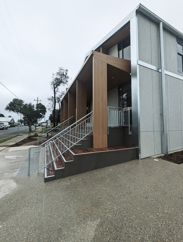 The entry to the building is also off centre, located at the intersection of Sydney Street and Annett Street. Intersections are commonly places where people congregate and stop. The entry location, and adjoining public forecourt provides the building entry with legible public address. Additionally, a small verandah, to the front of the building, responds to the heritage requirements of the village.